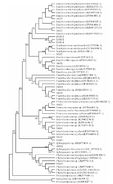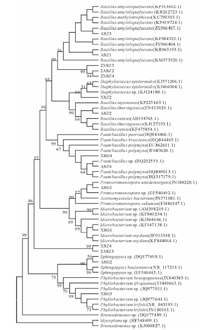20株可培养内生细菌中有15株成功提取其基因组DNA并扩增出16S rDNA 序列。经16S rDNA序列相似性分析和构建系统发育分析(图1), 表明2种嵩草属牧草分离到的内生细菌属于7个属8个种, 且2XSZ2, 2ASZ3和2XSZ4属于芽孢杆菌属, 但种的分类地位有待于进一步研究, XSZ4和2ASZ1在属水平的分类地位待定。7个属分别为芽孢杆菌属(Bacillus)、叶杆菌属(Phyllobacterium)、葡萄球菌属(Staphylococcus)、类芽孢杆菌属(Paenibacillus)、微杆菌属(Microbacterium)、原小单孢菌属(Promicromonospora)和鞘氨醇盒菌属(Sphingopyxis), 其中线叶嵩草中分离到5种, 分别是B. amyloliquefaciens、Phyllobacterium trifolii、S. epidermidis、Paenibacillus polymyxa和M. oxydans, 矮生嵩草分离到6种, 分别是B. amyloliquefaciens、B. thuringiensis、Paenibacillus polymyxa、M. oxydans、Promicromonospora umidemergens和S. bauzanensis。线叶嵩草根部内生细菌分别属于Phyllobacterium. trifolii、Paenibacillus polymyxa和M. oxydans, 种子内生细菌属于B. amyloliquefaciens、S. epidermidis和M. oxydans。矮生嵩草根部内生细菌分别属于Promicromonospora umidemergens和S. bauzanensis, 种子内生细菌属于B. amyloliquefaciens、B. thuringiensis、Paenibacillus polymyxa和M. oxydans。该结果表明, 牧草内生细菌种类丰富, 具有丰富的遗传多样性, 但在不同牧草或器官种类有差别。在上述15个内生细菌中, 6株属于芽孢杆菌属细菌, 说明芽孢杆菌属细菌为2种牧草内生细菌的优势菌群。
