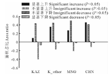 在这27年间, 虽然降水显著性减少的区域仅分布在蒙古国中北部、内蒙古东北部和哈萨克斯坦的东部地区, 但是区域内大部分地区的年降水仍呈现出下降趋势。 统计数据显示, 在MNG地区, 降水下降趋势最为明显, 超过90%的区域呈现下降趋势, 而有近30%的区域出现了显著性的下降。KAZ, K_other和CHN地区内下降的比例分别为64.4%, 50.4%和56.0%(图4)。