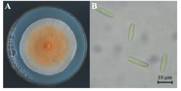 | 图1 “ 鲁保一号” 菌株菌落与分生孢子 A:“ 鲁保一号” 菌落Colony of Lubao No.1 strain; B:分生孢子Conidia of Lubao No.1 strain.Fig.1 Colony and conidia of Lubao No.1 strain |