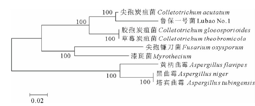 CTAB法[25]提取“ 鲁保一号” 菌株的基因组DNA, 采用引物ITS4 (5'-TCCTCCGCTTATTGATATGC-3')和ITS5 (5'-GGAAGTAAAAGTCGTAACAAGG-3')进行PCR扩增, 将PCR产物回收后送上海生物工程有限公司进行测序。将测得序列提交到NCBI Genebank (National Center for Biotechnology Information, 美国生物信息中心), 进行BLAST分析, 并利用MEGA 6.0软件构建系统发育树。