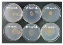 2.3.1 “ 鲁保一号” 菌株对潮霉素B的耐受性 选取 “ 鲁保一号” 菌株为材料, 在含不同潮霉素B浓度的PDA培养基上进行培养, 结果表明(图3), 在潮霉素B浓度为250 μ g/mL 的培养基上, 接种的分生孢子不能生长, 而在200 μ g/mL及较低浓度下在接种的分生孢子液边缘均长出菌丝。因此, 后续突变体库的构建过程中选取潮霉素B浓度为250 μ g/mL作为筛选浓度。