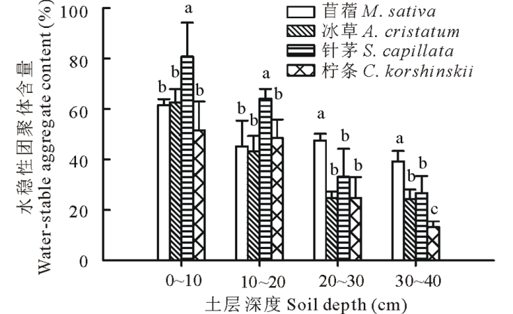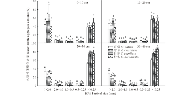 通过分析各草地类型间> 0.25 mm粒径的水稳性团聚体含量可知, 在0~10 cm土层, 针茅草地> 0.25 mm粒径的水稳性团聚体含量是最高的[(80.84± 13.40)%], 显著高于其他草地类型(P< 0.05), 其次是冰草草地[(62.25± 5.60)%]> 苜蓿草地[(61.46± 2.43)%]> 柠条灌木草地[(51.55± 11.34)%]。在10~20 cm土层, 针茅草地> 柠条灌木草地> 苜蓿草地> 冰草草地; 在20~30 cm和30~40 cm土层, 苜蓿草地> 0.25 mm粒径的水稳性团聚体含量显著高于其他草地(P> 0.05), 针茅草地次之, 而柠条灌木草地含量最少(图2)。