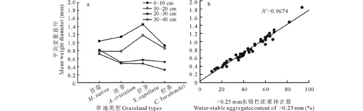 表层0~10 cm各草地的MWD值是最大的, 随土壤深度增加, MWD值逐渐降低, 苜蓿草地MWD值下降了31%, 冰草、针茅、柠条草地分别下降了58%, 77%和65%。在0~10 cm土层, 针茅草地的MWD值比苜蓿、冰草草地及柠条灌木草地分别高40%, 27%和58%。在20~30 cm土层, 苜蓿草地的MWD值最高, 比冰草草地和柠条灌木草地高60%, 比针茅草地高45%(图3a)。MWD与> 0.25 mm土壤水稳性团聚体含量呈极显著正相关关系(R2=0.9674), MWD值越大, > 0.25 mm粒径的水稳性团聚体含量越高, 土壤大粒径的水稳性团聚体含量越多(图3b)。