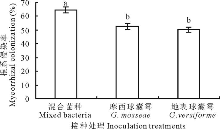 不同的接种处理下, 百合的根系侵染率存在一定差异(图1)。AM真菌根系侵染率由高到低为:混合菌种> G. mosseae> G. versiforme。接种混合菌种的处理, 百合根系侵染率最高, 为64.46%, 显著高于接种单一菌种的处理(P< 0.05)。百合单独接种G. mosseae、G. versiforme根系侵染率间差异不显著, 根系侵染率分别为52.62%、50.28%。