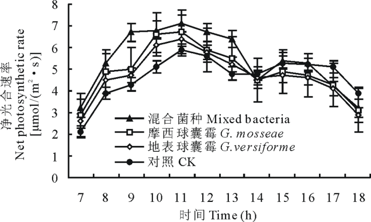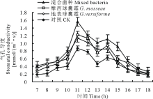 百合叶片的净光合速率的日变化大体上呈“ 双峰型” 变化, 在上午11时和下午15时出现高峰。AM真菌对百合叶片的净光合速率有着显著影响, 不同的接种处理, 影响不同, 以混合菌种对叶片的净光合速率的影响最为显著。接种混合菌种的百合, 净光合速率在上午11时达到最大值, 为7.1 μ mol/(m2· s), 日平均净光合速率为5.4 μ mol/(m2· s)。接种G. mosseae的百合, 净光合速率在11时则为6.7 μ mol/(m2· s), 日平均净光合速率为4.92 μ mol/(m2· s)。接种G. versiforme的百合, 净光合速率在11时则为6.4 μ mol/(m2· s), 日平均净光合速率为4.68 μ mol/(m2· s)。而未接种的对照处理的百合, 11时的净光合速率为5.9 μ mol/(m2· s), 日平均净光合速率为4.66 μ mol/(m2· s)(图2)。