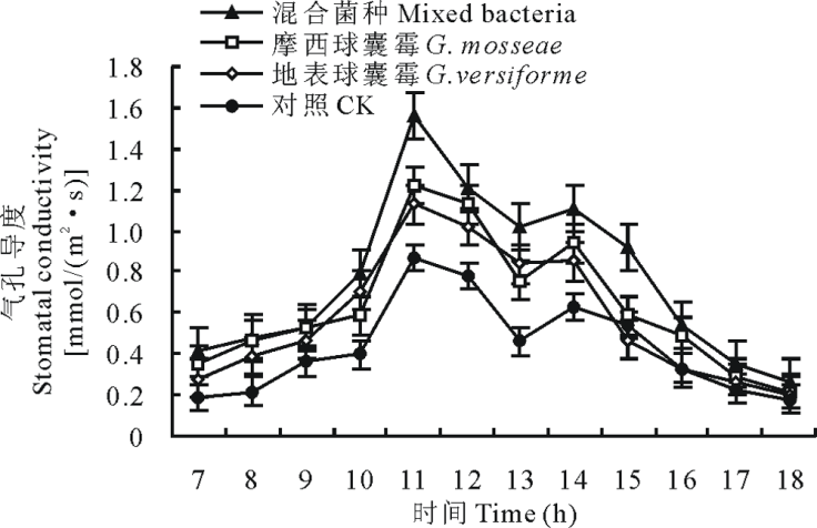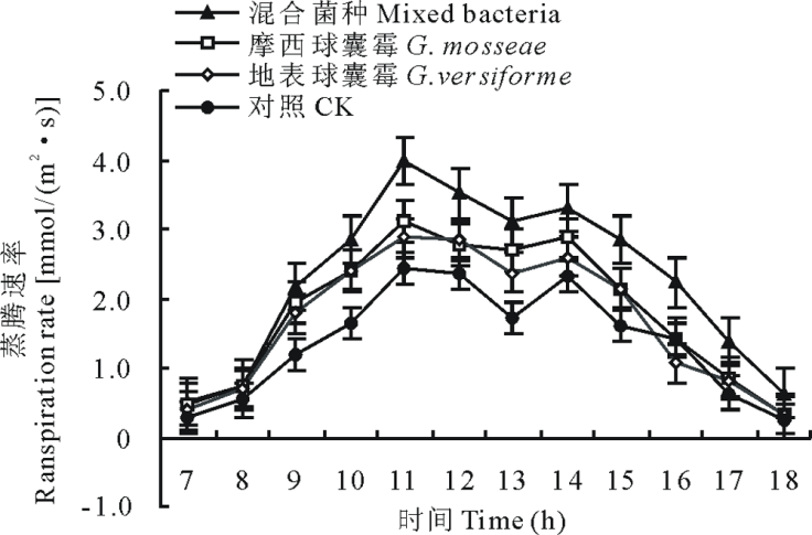 百合叶片的蒸腾速率的日变化也呈现“ 双峰型” 变化, 在上午11时和下午14时出现双峰。接种AM真菌的百合, 叶片蒸腾速率高于未接种的百合, 且接种混合菌种的百合的叶片蒸腾速率高于接种单一菌种的百合。接种混合菌种的百合, 叶片蒸腾速率出现的最大值为3.98 mmol/(m2· s), 日平均值为2.76 mmol/(m2· s); 接种G. mosseae的百合, 叶片蒸腾速率的最大值为3.12 mmol/(m2· s), 日平均值为1.82 mmol/(m2· s); 接种G. versiforme的百合, 叶片蒸腾速率的最大值为2.87 mmol/(m2· s), 日平均值为1.64 mmol/(m2· s); 未接种的百合, 叶片蒸腾速率的最大值为2.44 mmol/(m2· s), 日平均值为1.37 mmol/(m2· s)(图3)。