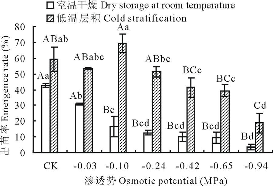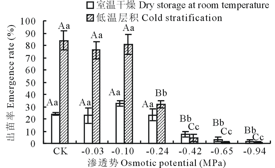 由图4知, 室温干燥果实出苗率随PEG溶液渗透势的减小而降低, CK处理下, 果实出苗率最高, 为42.67%, PEG溶液处理后的果实出苗率与CK处理存在显著差异(P< 0.05), CK、-0.03 MPa分别与-0.10~-0.94 MPa PEG溶液处理存在极显著差异(P< 0.01), 说明PEG溶液对温室干燥果实的出苗率具有较大影响。低温层积果实的出苗率随渗透势的减小呈先降低再增加后又降低的趋势, 在-0.10 MPa PEG处理下, 出苗率最大, 为69.33%, 与CK处理相比, 在-0.03、-0.10、-0.24 MPa PEG溶液处理下出苗率无显著降低(P> 0.05), 在-0.42、-0.65、-0.94 MPa PEG溶液处理下出苗率显著降低(P< 0.05), -0.94 MPa与CK、-0.03、-0.10、-0.24 MPa PEG溶液处理之间存在极显著差异(P< 0.01)。低温层积果实CK处理出苗率高出温室干燥果实的16.66%(图4)。