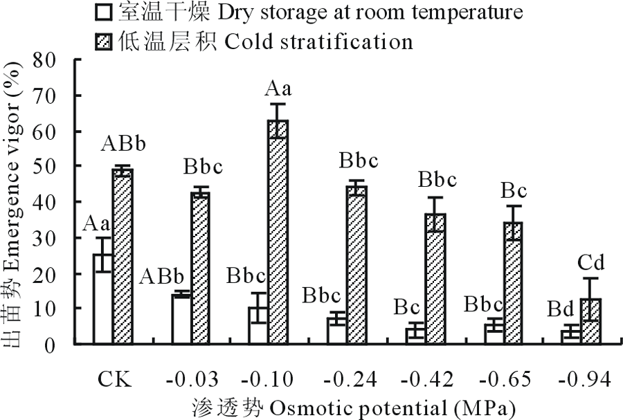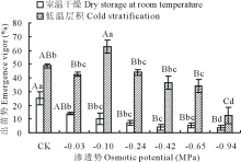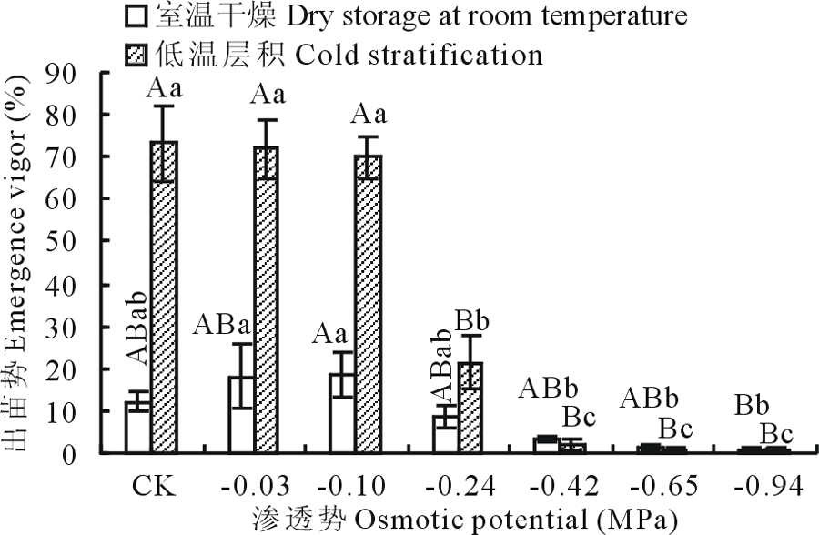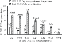 室温干燥果实的出苗势随PEG溶液渗透势的减小呈降低趋势, 在CK处理下出苗势最大, 为25.33%, PEG溶液处理后的果实出苗势与CK处理存在显著差异(P< 0.05), CK与-0.10~-0.94 MPa PEG溶液处理存在极显著差异(P< 0.01), 说明PEG溶液对室温干燥果实的出苗势具有较大影响。低温层积果实的出苗势随渗透势的减小呈先降低再增加后又降低的趋势, 在-0.10 MPa PEG处理下, 出苗率最大, 为62.67%, -0.10、-0.65、-0.94 MPa PEG溶液处理的果实出苗势分别与CK处理存在显著差异(P< 0.05), -0.10 MPa分别与-0.03、-0.24~-0.94 MPa PEG溶液处理存在极显著差异(P< 0.01)。低温层积CK处理出苗势高出室温干燥的23.34%(图5)。