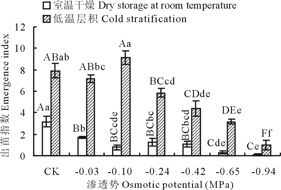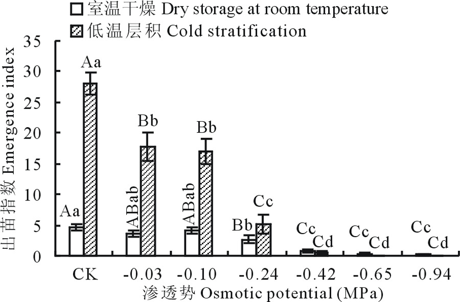 室温干燥种子的出苗指数随渗透势的减小呈先降低后增加再降低趋势, 在CK处理最大, 为4.61, 其CK处理种子出苗指数与-0.24~-0.94 MPa PEG溶液处理存在极显著差异性(P< 0.01)。低温层积种子的出苗指数随渗透势的减小呈降低趋势, PEG溶液处理下的种子出苗指数与CK处理均表现出极显著差异(P< 0.01), -0.03和-0.10 MPa分别与-0.24~-0.94 MPa PEG溶液处理存在极显著差异(P< 0.01), -0.24 MPa与-0.42~-0.94 MPa PEG溶液处理存在显著差异(P< 0.05)。低温层积种子CK处理出苗指数高出室温干燥种子的23.49(图3)。