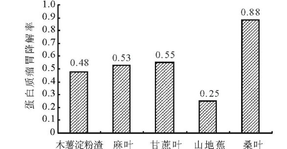 桑叶作为饲料具备以下重要价值:首先, 桑叶具备较高的营养价值。表现在其具备较高的蛋白含量, 丰富的Ca、P、Fe元素含量及较为平衡的氨基酸配比(表2); 其次, 桑叶在动物体内消化率高, 消化速度较快。中国农业科学院饲料研究所利用山羊开展的半体内尼龙袋试验表明, 山羊对桑叶粗蛋白消化率比较高, 最高可达0.88, 远高于其他几种饲料(图2)。