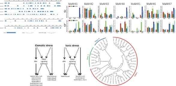 目前, 关于桑树功能基因这一领域开展了很多研究。首先, 桑树抗逆性基因的研究主要集中在抗盐碱, 抗旱基因上。NHX(钠氢反转运蛋白)基因家族, 参与调控细胞内钠、钾离子和pH平衡, 在植物抗盐胁迫和蛋白分选等方面起重要作用。分析发现桑树NHX基因家族对不同植物激素、信号分子和非生物胁迫都有响应, 不同基因响应表达模式不同, 该成果为研究桑树耐盐机制和分子育种提供理论基础和候选基因。分离到的可能与抗盐抗旱性有关的7个基因中, 除6号基因与拟南芥(Arabidopsis thaliana)相关抗逆功能基因相似以外, 其余均与胡杨相关抗逆功能基因的进化相近(图5)[8]。