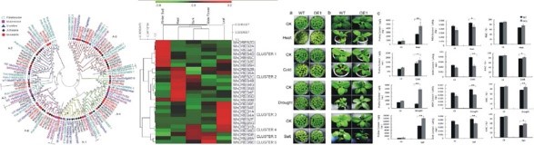 另一个抗旱相关基因为DREB基因家族, DREB是一类逆境应答基因表达的转录因子, 是植物逆境适应中的关键性调节因子。研究阐明了桑树DREB基因家族的分子结构和表达模式; 筛选到一个优良基因— — MnDREB4并开展相关功能研究, 结果表明其过量表达不影响桑树生长的同时显著提高了其抗旱性(图6)[9, 10]。以上研究为桑树抗盐碱、抗干旱的分子机制找到了依据, 同时, 为进一步提升相关抗性做好了准备。
