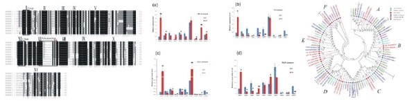 此外, 还开展了涉及非生物胁迫和生物胁迫的相关基因家族— — MAPK基因家族的研究。MAPK在植物生长发育和多种生物、非生物胁迫信号转导过程中起着关键作用。研究鉴定并克隆了10个桑树MAPK基因, 筛选获得两个优良基因, 为进一步研究桑树MAPK基因功能奠定基础(图7)[11]。