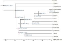 过去的传统研究认为, 桑树的染色体数目为n=14。通过对“ 川桑全基因组序列草图” 的分析确认了川桑的染色体数目为n=7, 2n=14。这是对迄今学术界普述的桑2n=28的重大挑战。由此提出了我们对桑的染色体数目以及与之相关的遗传、进化、育种等诸多方面的一系列科学问题, 需要重新认识[20]。在迄今有关桑树的著述中均将桑列入荨麻目(Urticales), 但根据对川桑染色体数目及基因组分析, 证明桑与蔷薇目(Rosales)蔷薇科(Rosaceae)的苹果、梨等的亲缘关系最近。也就是说, 桑应归为蔷薇目。根据对桑树基因组的进化研究发现, 大约在8820万年前与蔷薇目分化, 而桑科则在6350万年前与大麻分化(图13)。