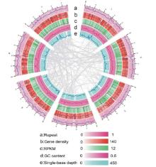 近年来, 随着企业的产业化投入, 蚕桑业得到了一定的发展, 立桑为业拓展利用呈现出很好的发展前景。但过去几千年蚕桑科技的整个学科是不完整的, 长期以来都围绕一粒茧, 一根丝, 孤芳自赏, 主要着眼于种质资源、栽培和病虫害防治, 远离现代科技。要想蚕桑业能够更上一层楼, 科技必须要跟上。因此, 我们从基因组角度做了一些探索。已开展的研究包括, 桑树基因组的解析、桑树功能基因研究及桑树染色体与进化研究。以在四川原始森林当中发现的一种川桑(M. notabilis)作为测序的材料。通过基因解析发现, 川桑基因组大小为330 Mb, 编码基因29338个(图4)[7]。