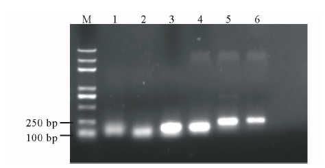 1.2.3 qRT-PCR引物设计及普通PCR扩增 参照qRT-PCR引物设计的一般原则, 根据上述得到的6个内参基因的cDNA序列, 用Primer Premier 5.0设计用于荧光定量PCR的引物(表2)。为验证设计引物的准确性, 先进行普通PCR扩增, 反应条件为:94 ℃ 3 min; 94 ℃ 30 s, 55 ℃ 30 s, 72 ℃ 30 s, 30个循环; 72 ℃ 5 min。待PCR反应结束后, PCR产物用1%琼脂糖凝胶电泳检测。