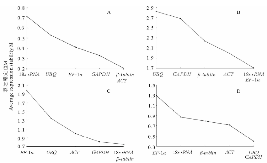 从以上3个分析软件对6个候选基因在草地早熟禾不同组织器官、生长期、激素和非生物胁迫下稳定性分析的结果中, 可以看出:1)GAPDH最适合作草地早熟禾不同组织器官的内参基因, 其他候选内参基因稳定性较差, 不适合用于组织器官间的基因表达分析; 2)β -tublin和18s rRNA最适合作草地早熟禾在不同激素诱导下的内参基因; 3)EF-1α 最适合作草地早熟禾在非生物胁迫下的校正基因; 4)ACT最适合作草地早熟禾叶片不同发育时期的内参基因, 但其他5个基因NormFinder分析的M值均小于0.5(M值小于0.5可视为稳定性较好), 表达稳定, 这说明6个候选内参基因在草地早熟禾叶片发育不同时期的基因表达分析中均可用作校正基因。