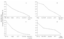 2.3.3 BestKeeper分析软件 BestKeeper是通过标准偏差SD值对候选基因的稳定性进行评价和排序, SD值越小, 该基因的稳定性越好; 若SD> 1, 则认为该基因不稳定[11]。分析结果表明(表4), 草地早熟禾不同组织中候选内参基因的稳定性由高到低排序是:18s rRNA> GAPDH> UBQ> ACT> β -tublin> EF-1α ; 不同生长期的顺序是:ACT> GAPDH> UBQ> EF-1α > β -tublin> 18s rRNA; 不同激素处理后稳定性由高到低的顺序是:β -tublin> 18s rRNA> ACT> GAPDH> UBQ> EF-1α ; 而草地早熟禾在非生物胁迫下候选内参基因的稳定性为18s rRNA> EF-1α > ACT> β -tublin> GAPDH> UBQ。