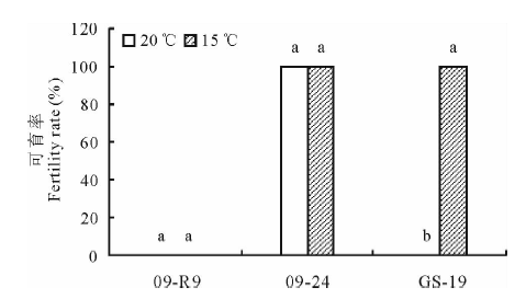 2014年3月花盆直播细胞质雄性不育系09-R9、保持系09-24、温敏核雄性不育系GS-19, 每个材料播20盆。显球后分别移入20 ℃(16 h光照/8 h黑暗)和15 ℃(16 h光照/8 h黑暗)的人工智能气候箱中, 开花期观察统计育性情况, 可育率为可育花朵占每株随机抽取100朵花的百分数, 每株重复3次, 取10盆的平均值。