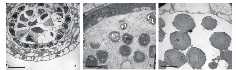 保持系09-24花药发育的初期, 造孢细胞呈多边形, 核大质体多, 从外围形成液泡, 并有胼胝质壁包裹, 绒毡层发达, 部分细胞有双核仁, 无壁由膜包裹, 呈分泌细胞状态, 内含物分解后呈点状分布在膜上, 再从膜上逐渐释放出供孢子发育(图8A)。到四分体时期, 四分孢子被共同的胼胝质包围, 壁外侧出现了一层有缺口的电子致密带, 其上沉积了大量的黑色箭状物质。四分孢子中细胞器含量丰富, 质体高度发育, 绒毡层胞质进一步浓缩成一团, 着色很深 (图8B), 四分体孢子分裂形成正常的单核花粉粒。小孢子发育后期, 中央大液泡逐渐变小至消失, 细胞内含物逐渐增多至布满整个细胞, 小孢子经过不对称有丝分裂形成成熟花粉粒, 花粉粒细胞的内壁物质在局部向内侧扩展并显著增厚, 绒毡层细胞消失, 成熟花粉粒呈圆形(图8C)。