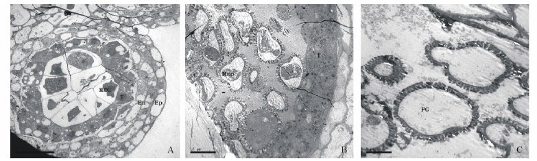 在高温(20 ℃)条件下, GS-19花药发育受阻, 完全不育。花药发育早期, 和低温条件下一样, 雄蕊原基已分化出4层, 从外到内依次是表皮、药室内壁、中层和绒毡层。绒毡层细胞呈长方形, 排列整齐, 核大, 核仁染色明显。花粉母细胞的形态与周围的药壁细胞明显不同, 细胞排列整齐而有序, 细胞壁形状规则, 细胞核大, 核仁染色明显, 没有明显的液泡(图11A)。随着花药的进一步发育, 四分体孢子形成后也被共同的胼胝质包围, 壁外侧也见有一层带缺口的电子致密带, 但其上沉积了大量茸毛状物质。四分孢子分裂形成单核花粉粒, 单核花粉粒中细胞器较可育少, 但液泡明显比可育多, 可见液泡吞噬现象, 绒毡层未解体(图11B)。开花前, 绒毡层完全解体, 形成的花粉粒内含物消失, 只剩下壁外侧有一层带缺口的电子致密带, 不能形成正常的花粉粒(图11C)。