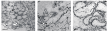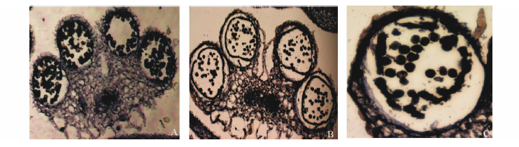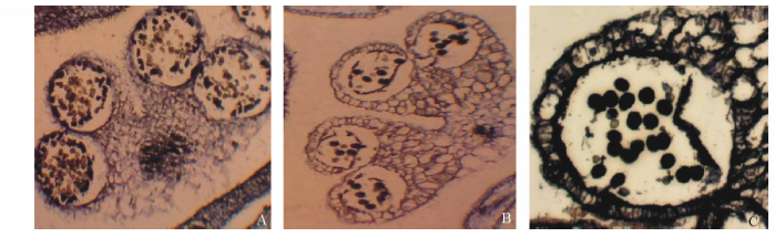 细胞质雄性不育系09-R9花药发育早期和保持系09-24一致, 呈扁圆形, 在4个角隅处分化形成孢原细胞, 进一步发育形成正常的造孢细胞。当花蕾长约 1.0 mm 时, 造孢细胞已形成清晰的药室, 药室壁层染色较深, 花药壁能形成表皮、药室内壁、中层和绒毡层, 初生造孢细胞有丝分裂形成花粉母细胞, 在花粉母细胞早期, 细胞质开始浓缩解体, 大部分不能进行减数分裂, 只能形成少量染色较浅的四分体, 此时花药横切面呈蝴蝶形(图5A), 随着花药的进一步发育, 花粉囊逐渐变形, 囊壁变薄, 囊内的物质也在解体, 花粉囊也逐步解体(图5B)。到开花前, 花药室已经完全解体, 只留维管束和一部分残壁染色较深, 不能形成正常的花粉粒(图5C)。