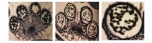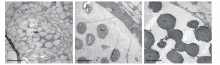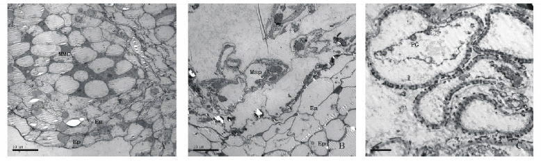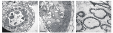 细胞质雄性不育系09-R9花药发育初期和保持系09-24一致, 造孢细胞呈多边形, 核大质体多, 从外围形成液泡, 并有胼胝质壁包裹, 绒毡层发达, 部分细胞有双核仁, 无壁由膜包裹, 呈分泌细胞状态, 内含物分解呈点状分布在膜上, 再从膜上逐渐释放出供孢子发育(图9A)。随着花药的发育, 四分孢子形成后也被共同的胼胝质包围, 壁外侧也见有一层带缺口的电子致密带, 但其上沉积了大量茸毛状物质。四分孢子分裂形成的单核花粉粒中细胞器较可育少, 但液泡明显比可育多(图9B)。花粉粒形成过程中, 小孢子细胞愈发皱缩, 内含物消失, 不能形成正常的花粉粒(图9C)。