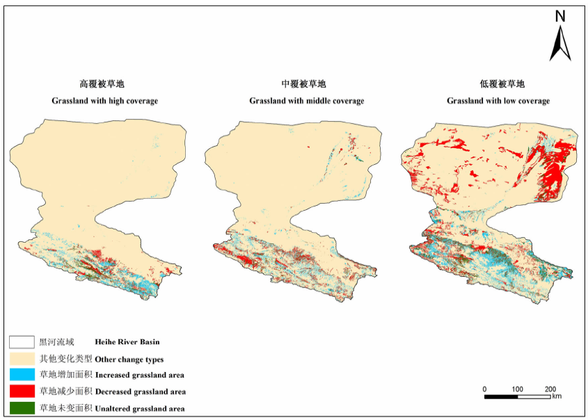 (1) 近30年间黑河流域草地呈现先减后增的趋势, 但远未到达1986年的草地面积, 这主要是由低覆盖草地大量减少导致。