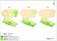 运用CA-Markov模型, 预测黑河流域2022年草地面积, 结果如图4所示, 草地总面积为24449.58 km2, 高覆被草地、中覆被草地面积和低覆被草地面积分别为5560.28、5657.65和13231.65 km2, 其草地总面积大于2000和2011年面积, 但不及1986年草地总面积。2022年高覆被草地面积, 中覆被草地面积低于1986和2011年的面积, 较2000年草地面积略有升高, 低覆被草地面积较2000和2011年有所升高, 但是远不及1986年的水平。表明在此趋势下, 2022年黑河流域草地面积呈现总体好转, 局部下降的趋势。