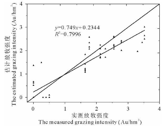 (2)根据地上生物量的实际变化值和牧草生长量估算的谢尔塔拉牧场放牧强度大致为1~2.5 Au/hm2, 与实际放牧情况相符, 属于过度放牧状态。本文所建方法能够较准确地将轻度、中度和重度放牧区分开, 高放牧区多位于牛多地少的生产队和小型湖泊周边, 低放牧区位于围封草地和海拉尔河周边, 且海拉尔区东北方向的放牧强度明显高于西南地区。