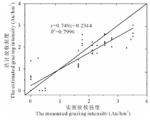 由验证结果可知, 该方法能够较准确地估算谢尔塔拉镇和海拉尔区的放牧强度, 验证结果决定系数达0.7996, 基本能将轻度、中度和重度放牧区分开。但部分放牧区存在一定低估现象, 一方面可能由于计算实际放牧强度时, 未成年牲畜列入成年牲畜考虑, 导致实际放牧强度偏高; 另一方面是在估算草地地上生产力时存在一定误差。降水影响草地地上地下生物量的分配, 王艳芬等[29]的研究结果表明降水充足的年份地上生物量占总量的比例会明显增多。2014年6、7月份呼伦贝尔市降水充足, 按照文献中的比例计算地上生产力时在一定程度上会低估地上生物量, 进而导致放牧强度部分低估的结果。另外, 在低放牧区有两个点存在明显高估现象, 这两点位于道路两旁, 单个像元包含多种地类, 混合像元引起估算误差。