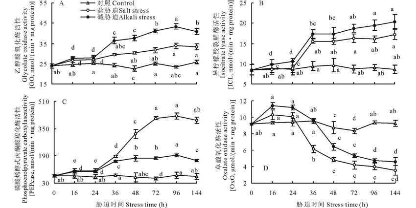 GO既能催化乙醇酸氧化生成乙醛酸, 还可继续催化乙醛酸生成草酸。而ICL可催化异柠檬酸裂解, 其产物之一为乙醛酸[25], 后者又在GO催化下氧化生成草酸。在外施盐、碱胁迫24 h后, GO, ICL的活性均显著升高(P< 0.01), 尤其以碱胁迫更为突出。相关分析表明, 叶片中GO和ICL酶活性与茎叶部分草酸含量均为正相关关系。但前者的相关度(r=0.739)大于后者(r=0.549)。因此可以说, GO可能在植物合成草酸过程中起着更为重要的作用。这与以往的报道一致[24]。