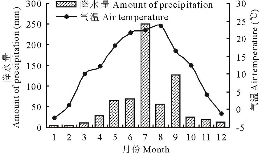 本试验地位于甘肃东部的甘肃省农业科学院镇原试验站(35° 29'42″N, 107° 29'36″E)。当地海拔1297 m, 年均气温8.59 ℃, 年日照时数2449.2 h, ≥ 10 ℃年积温2722 ℃, ≥ 0 ℃年积温3435 ℃, 无霜期165 d。年均降雨量540 mm, 主要集中在7-9月。地下水埋深60~100 m。试验地的土壤为黑垆土, 经测定播前0~20 cm土壤有机质12.4 g/kg, 碱解氮67 mg/kg, 有效磷13.89 mg/kg, 速效钾184 mg/kg, pH值8.21, 全盐量0.037%; 20~40 cm土壤含有机质11.8 g/kg, 碱解氮65 mg/kg, 有效磷11.35 mg/kg, 速效钾159 mg/kg, pH值8.14, 全盐量0.05%。试验于2013年6-10月进行, 当年气温和降水见图1。