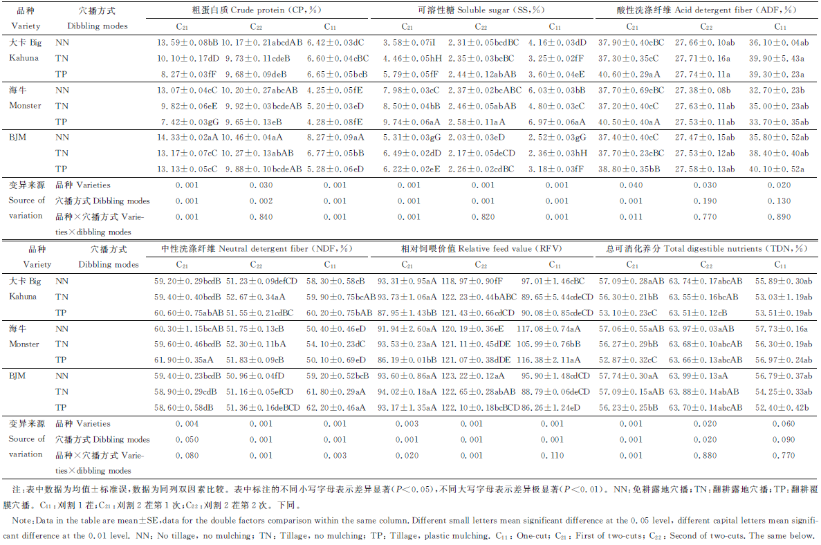 CP、SS、ADF和NDF含量为本试验实测值, RFV值和TDN含量为计算值, 结果见表1, 比较分析结果见表2。总体可以看出, 品种对C11、C21和C22时的SS含量、NDF含量和RFV值均影响极显著(P< 0.01), 对ADF含量均影响显著(P< 0.05); 对C21和C11时的CP含量影响极显著(P< 0.01), 对C22时的CP含量和TDN含量影响显著(P< 0.05); 对C21时的TDN含量影响极显著(P< 0.01)。穴播方式对C11、C21和C22时的CP含量、SS含量和RFV值均影响极显著(P< 0.01), 对C21时的ADF含量影响极显著(P< 0.01), 对C21时的NDF含量影响显著(P< 0.05), 对C22和C11时的NDF含量影响极显著(P< 0.01), 对C21时的TDN含量影响极显著(P< 0.01), 对C22时的TDN含量影响显著(P< 0.05)。品种× 穴播方式互作对C21和C11时的CP含量和SS含量影响极显著(P< 0.01), 对C21时的ADF含量影响显著(P< 0.05), 对C22和C11时的NDF含量影响极显著(P< 0.01), 对C21时的RFV值影响显著(P< 0.05), 对C22时的RFV值影响极显著(P< 0.01), 对C21时的TDN含量影响极显著(P< 0.01)。