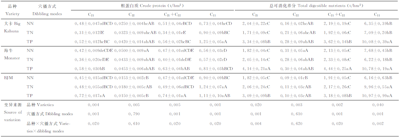 以上可以说明, 就品种的平均效应而言, 在C11时, 品种以BJM的TDN产量最高; 而在C21+C22时, 以海牛的TDN产量最高。就穴播方式的平均效应而言, 在两种刈割方式下, 穴播方式均以TP的TDN产量最高。品种和穴播方式存在明显互作效应, 在两种刈割方式下, 3个品种均应选择TP。