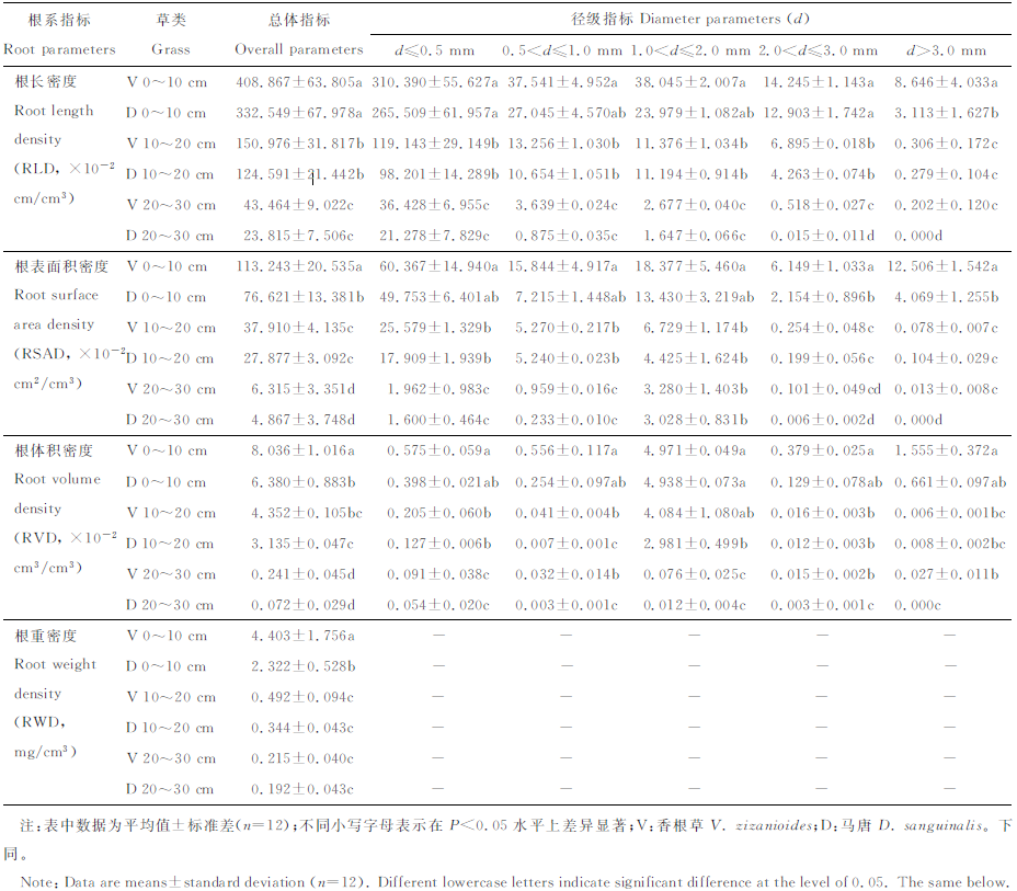 2.1.2 径级分布特征 2种草类根系径级指标如表2所示, 同一土层, 香根草根系的各项径级指标均优于马唐。不同土层同一径级RLD、RSAD和RVD的显著性具有相似的排序, 如香根草d≤ 0.5 mm径级, RLD、RSAD和RVD的显著性排序是香根草0~10 cm> 香根草10~20 cm> 香根草20~30 cm, 其他径级亦然。0~10 cm土层, 香根草与马唐根系的各项径级指标均优于10~20 cm和20~30 cm土层。值得指出的是, 1.0< d≤ 2.0 mm的各项径级指标与0.5< d≤ 1.0 mm的基本持平, 却显著大于2.0< d≤ 3.0 mm的径级指标。