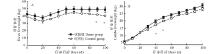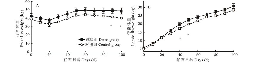 家畜体重100 d的跟踪调查结果如图1所示, 母羊除了早期体重有重大损失外, 其他时段没有明显的体重变化, 但试验组母畜体重在最后的20 d显著高于对照组。仔畜体重一直处于增加状态, 试验组和对照组仔畜体重在40 d龄时出现显著性差异, 其他时段试验组仔畜的体重均大于对照组仔畜的体重, 但并无显著性差异。