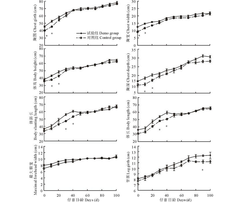 研究家畜体尺的变化发现, 母畜体尺在100 d时间内并无显著性变化。仔畜体尺变化如图2所示, 试验组和对照组仔畜体尺均呈逐渐增加趋势, 且试验组仔畜体尺的增长趋势较对照组高。在最开始的20 d, 仔畜胸围、胸宽、体高和胸深在试验组的增长显著高于对照组(P< 0.05), 从30日龄开始, 试验组仔畜体长和体斜长开始显著高于对照组(P< 0.05), 补饲对家畜管围和最大额宽影响不显著。