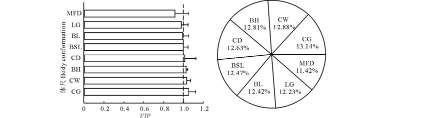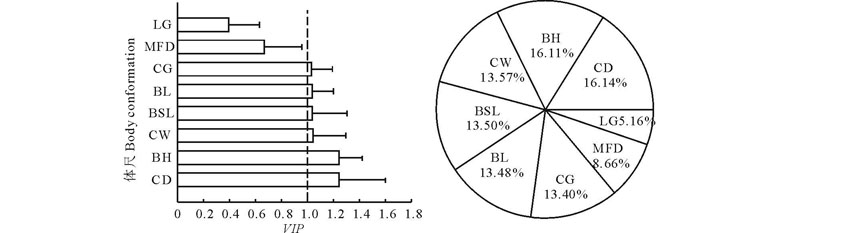 运用SAS 9.0软件对家畜体尺及日增重做方差分析, 运用SIMCA-P 11进行偏最小二乘回归分析(partial least squares regression, PLSR), 建立家畜体重与体尺指标(体高、体长、胸围、管围、体斜长、胸深、胸宽、最大额宽)的回归方程, 并根据回归方程的变量投影重要性指标(VIP, variable importance), 计算可得各种影响要素的权重系数ω Xj。