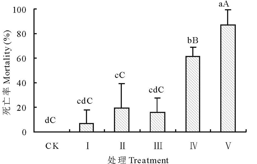 不同程度的子叶切除处理后, 苦豆子幼苗的死亡率受到不同程度的影响, 幼苗的死亡率与子叶切除的程度呈正相关, 结果如图1所示。其中, CK、Ⅰ 、Ⅱ 、Ⅲ 、Ⅳ 、Ⅴ 处理组幼苗的死亡率分别为0、7.00%、19.50%、16.00%、61.34%和86.95%。同时, 处理Ⅰ 与处理Ⅲ 组间差异不显著(P> 0.05), 两处理组与CK间也均无显著性差异(P> 0.05); Ⅱ 、Ⅳ 和Ⅴ 处理组与CK间均存在显著性差异(P< 0.05), 处理Ⅰ 、Ⅱ 和Ⅲ 间差异不显著(P> 0.05); CK、Ⅰ 、Ⅱ 、Ⅲ 处理间均不存在极显著差异(P> 0.01), Ⅳ 与Ⅴ 间存在极显著差异(P< 0.01), 且两处理与对照及其他处理间也均存在极显著差异(P< 0.01)。结果显示, 幼苗的死亡率随子叶丢失程度的增加而显著增加。