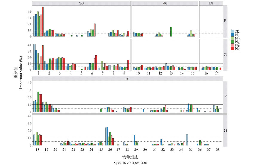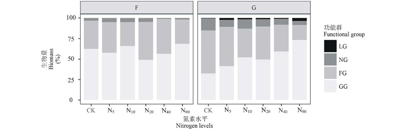功能群将具有相似生活型、特性或对环境因子响应类似的植物进行分组, 基于功能群的研究方法是评估物种和群落对环境因子改变所做出响应的有效手段[20]。参考王谢等[21]的方法按可食性进行功能群划分并计算各功能群地上生物量占总地上生物量的百分比以表征不同物种在群落中的功能。将植物群落以可食性划分为4个组:可食禾草类(grass species group, GG), 包含莎草科干生苔草(Carex aridula)、非禾本科可食草类(forbs species group, FG)、可食性低劣或有毒害草类(noxious species group, NG)、豆科类(leguminous species group, LG)。