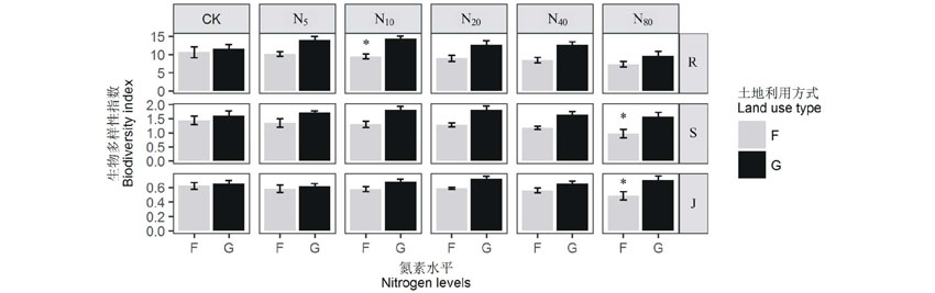利用R软件进行数据整理、分析及作图。采用双因素方差(Two-way ANOVA)分析草地管理方式和氮素添加对草地地上生物量和物种多样性的影响, 用Tukey法进行多重比较, 进一步分析封育草地和放牧草地各施肥水平间及同一施肥水平下封育草地和放牧草地地上生物量与物种多样性差异。采用Pearson法检验物种多样性与地上生物量间相关性, 并做一般线性回归。用Shapiro-Wilk test和Bartlett test检验数据正态性和方差齐性。