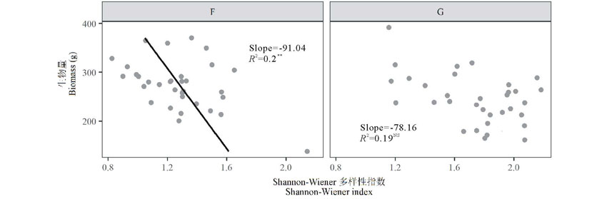 封育施肥草地的Shannon-Wiener多样性指数和地上生物量呈显著负相关(r=-0.47, P< 0.01), 在放牧施肥草地两变量并无显著相关性(图5)。