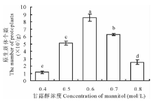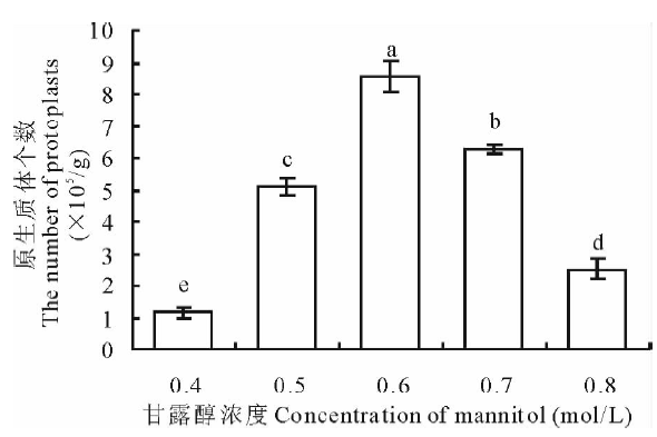 2.1.2 渗透压优化 植物细胞在缺少细胞壁的保护之后, 对外界的渗透压会非常敏感。因此, 渗透压的优化是原生质体提取的一个重要环节。选择2周大的黄化苗在保持酶解时间不变的条件下, 选择不同渗透压条件进行原生质体的提取。如图2所示, 当甘露醇浓度为0.4 mol/L时, 得到非常少量的原生质体, 随着浓度上升, 原生质体提取量迅速增大, 在甘露醇浓度为0.6 mol/L时原生质体提取量达到了最大值。之后随着甘露醇浓度的增大, 原生质体的量又迅速的减少。