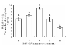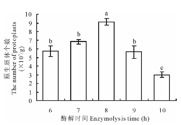 2.1.3 酶解时间优化 在黄化苗苗龄及渗透压一致的条件下, 酶解时间能明显影响原生质体的产量。如图3所示, 酶解7和8 h都能获得大量的原生质体, 并且8 h获得的原生质体数最多。在酶解6~8 h之间, 原生质体数量随着酶解时间增大而显著增加, 当大于酶解8 h时, 原生质体数量则随着酶解时间的增大而减小, 而且发现游离的细胞碎片明显增多。