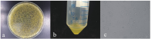 综合分析影响柳枝稷叶肉原生质体制备的主要因素, 柳枝稷叶肉原生体质体系得以优化。选取2周大的柳枝稷黄化幼苗为实验材料, 酶解液中甘露醇浓度为0.6 mol/L, 酶解8 h。流程如下:对Alamo柳枝稷种子进行灭菌处理, 维持在(28± 2) ℃, 黑暗条件下培养2周, 取柳枝稷黄化幼苗的叶片切割成1 mm宽的细条, 将切好的苗条与酶解液充分接触(图4a), 对得到的原生质体进行沉淀纯化, 消除分离过程中的破裂细胞和未酶解的碎片, 获得原生质体(图4b)。基于上述流程所得到的原生质体大, 碎片少, 量多, 活性强(图4c), 满足进一步的遗传转化实验条件。