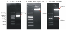 从水稻基因组数据库中(http://rice.plantbiology.msu.edu)下载OsMYB103(ID:Os08g05520)的基因序列。根据序列信息LN载体的引物LN-EcoRI-103: AGCTCAAGCTTCGAATTCATGGGGCATCACTCTTGCTGC; LN-BamHI-103: AGCGGCAGCAGCCGGATCCTTAATCATGGTCATTTGGTCCCATA, 用高保真酶进行扩增, 其长度约为1000 bp。将扩增片段连上载体pEASY-T5(CT501, 全式金), 通过热激导入到菌株为BH5a的感受态大肠杆菌中(CD-201, 全式金), 之后挑菌测序。将携带正确质粒的大肠杆菌扩繁, 提取pEASY-103质粒, 用NEB公司的酶切体系, 分别对pEASY-103和LN载体进行双酶切。结果如图5a, pEASY-103酶切后有个1000 bp的片段, 这是目标基因OsMYB103, LN载体酶切后为10 kb以上的片段(图5b), 分别将这两段切胶回收, 再利用NEB公司的连接酶进行反应, 得到LN-103(LN-OsMYB103), 之后导入感受态大肠杆菌, 挑选阳性克隆测序。经酶切与测序检测, 质粒LN-103完全正确(图5c)。