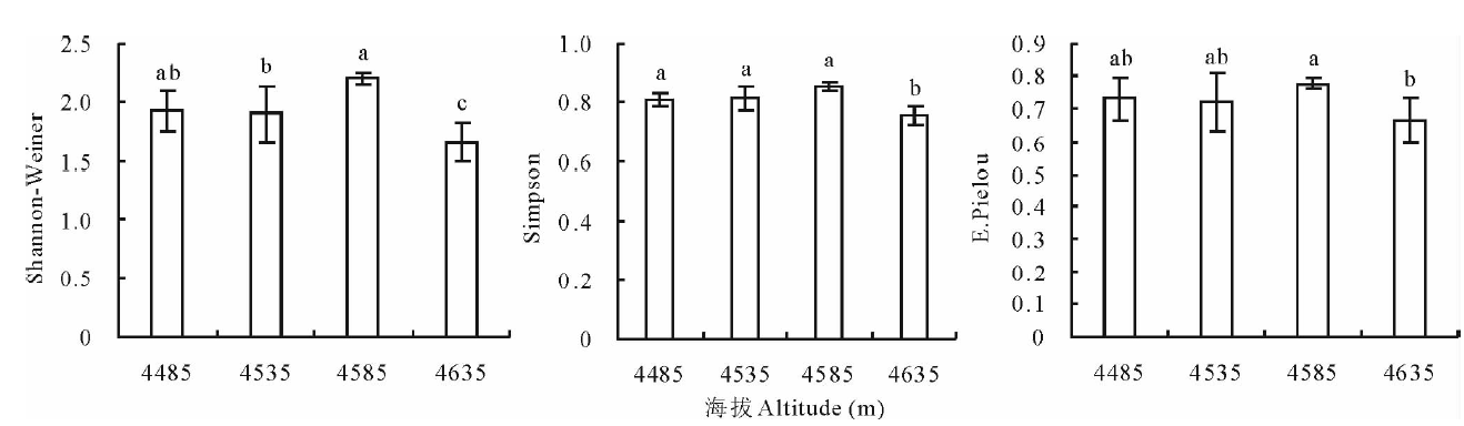 | 图4 不同海拔梯度对高寒草地物种多样性的影响Fig.4 Variation of plant diversity of alpine grassland community under different altitudinal gradients |
