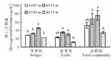 由于豆科类和禾本科植物地上生物量过小, 仅选取莎草类和杂草类两种主要功能群的生物量进行分析, 其相对整体地上生物量也呈现类似规律(图1)。莎草类的最大值在海拔4585 m、最小值在海拔4635 m, 最小值相对最大值下降99.4%, 且最大值与其他梯度存在显著差异, 但其他梯度之间的差异不显著(P> 0.05)。杂草类的最大值在海拔4535 m、最小值在海拔4635 m, 且比前者显著下降了194.2%, 虽然中间两梯度生物量较高但前3个梯度之间差异并不显著(P> 0.05)。综上, 实验区主要功能群的地上生物量随海拔的变化呈现与整体类似的“ 单峰型” 特征, 而杂草类的生物量峰值在海拔4535 m左右且总体低于莎草类。群落总体及主要功能群的地上生物量都在海拔4585 m左右达到最大, 并在海拔4635 m左右降到最小, 并呈现继续下降的趋势。