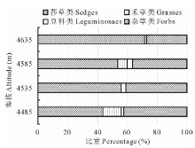 功能群结构以莎草类和杂草类为主, 伴随少量禾草类和豆科类, 不同功能群的重要值占植物群落比重沿海拔梯度的变化情况如图3所示。禾草类出现在海拔4485和4585 m两个梯度, 重要值比重从12.5%降至6.0%, 另3类功能群在全部梯度都出现。占比最小的豆科类从低海拔的1.5%上升到中等海拔的3.8%到高海拔回落到1.4%。而莎草类和杂草类作为主要功能群, 莎草类的重要值占比从43.5%逐渐增到71.5%, 优势度不断增大; 杂草类呈现下降趋势, 从海拔4485 m梯度的44.1%降至4635 m梯度的28.5%。这两个主要功能群重要值比例的优势沿海拔梯度逐渐增大, 莎草类优势增加更为明显。